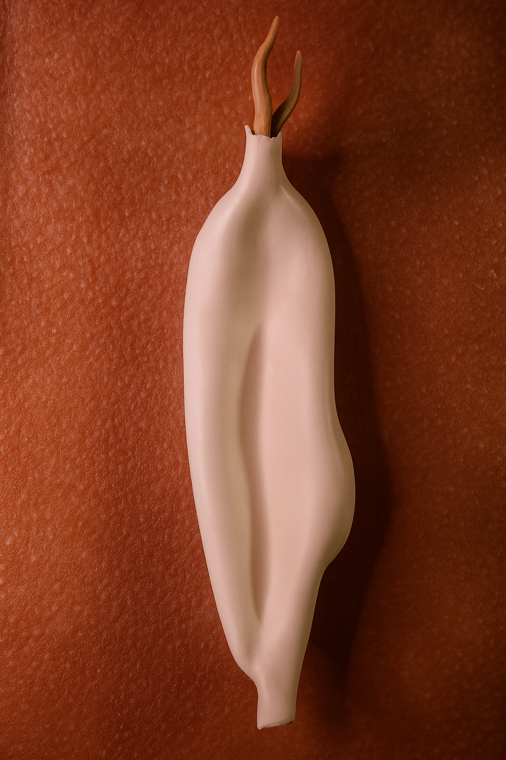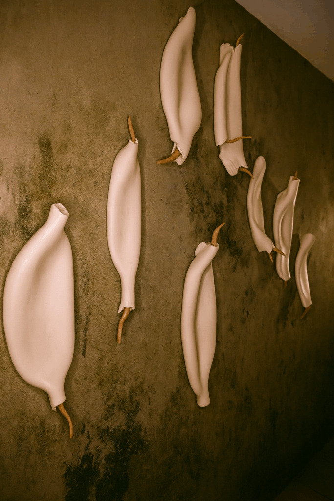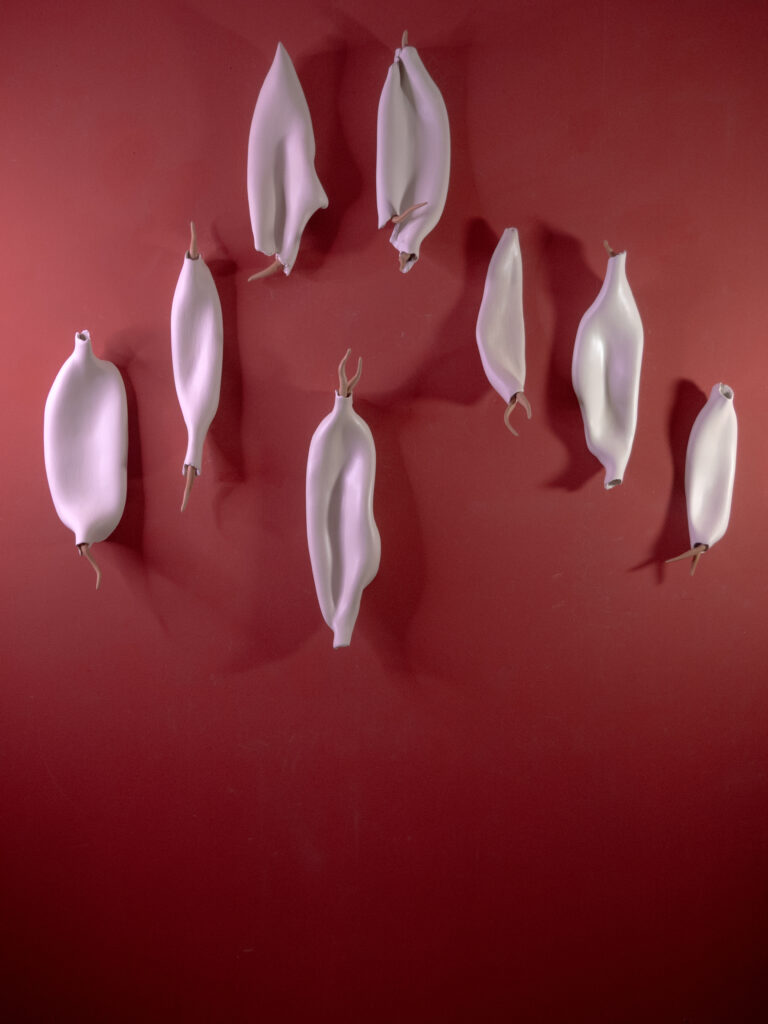 Esta instalación mural, compuesta por ocho piezas cerámicas, forma parte de la serie Mutaciones Sensibles y se presenta en un campo especulativo donde los cuerpos comienzan sus procesos de transformación. Modeladas enteramente a mano en arcilla blanca, bruñidas hasta alcanzar una superficie satinada, y rematadas en sus extremos con detalles de terracota, estas formas evocan vainas, cápsulas o membranas que aluden a una morfología emergente.