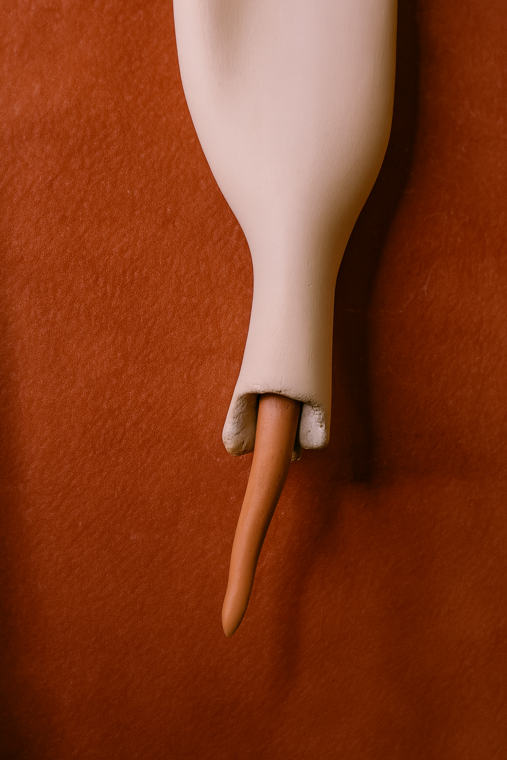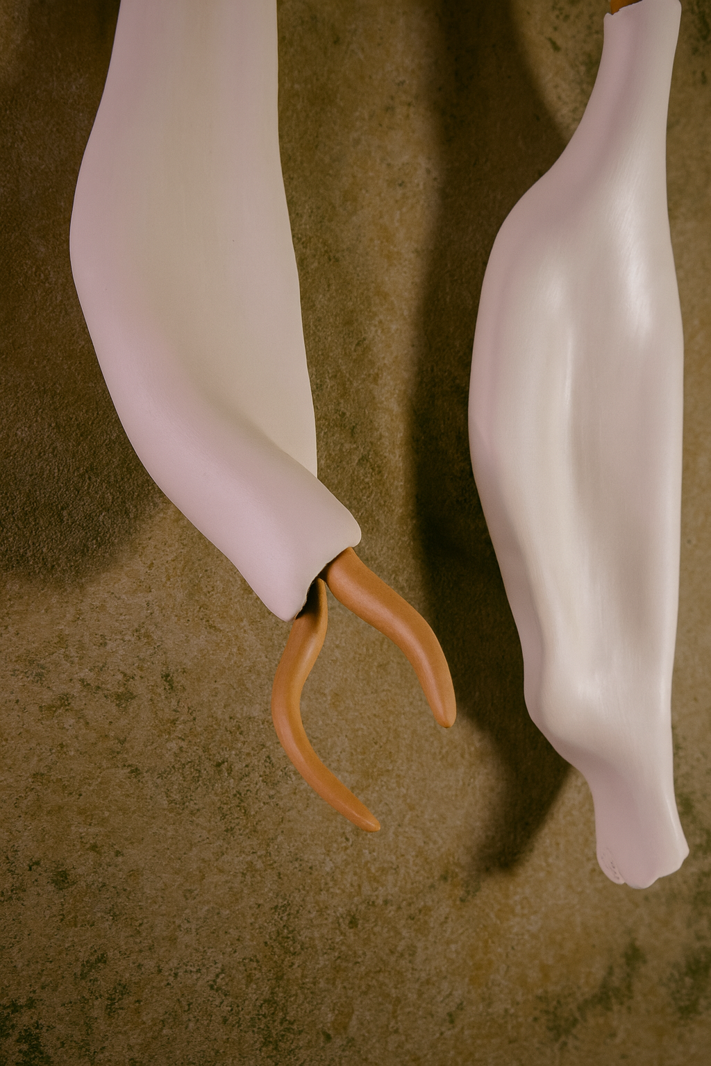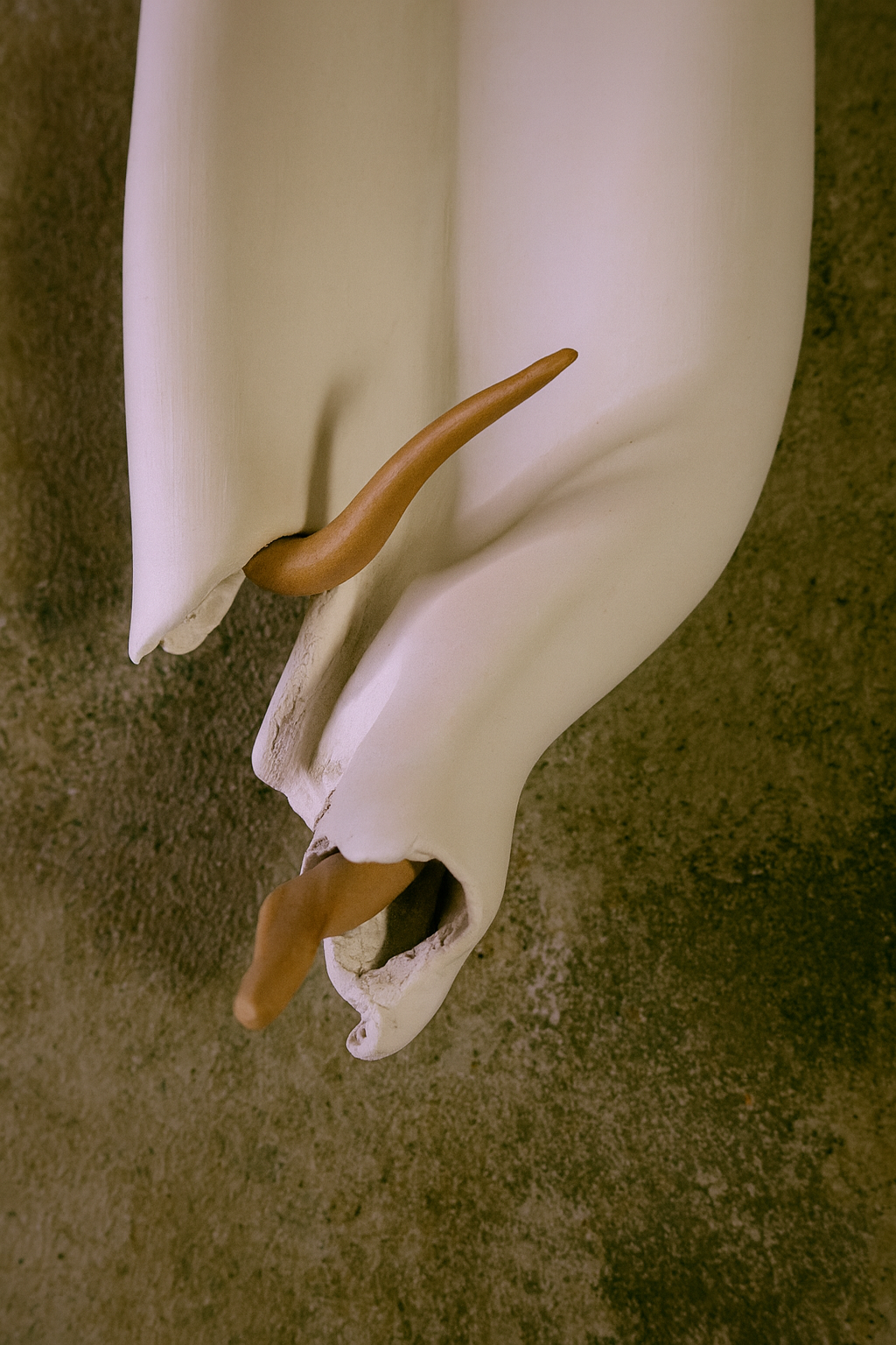 Esta instalación mural, compuesta por ocho piezas cerámicas, forma parte de la serie Mutaciones Sensibles y se presenta en un campo especulativo donde los cuerpos comienzan sus procesos de transformación. Modeladas enteramente a mano en arcilla blanca, bruñidas hasta alcanzar una superficie satinada, y rematadas en sus extremos con detalles de terracota, estas formas evocan vainas, cápsulas o membranas que aluden a una morfología emergente.